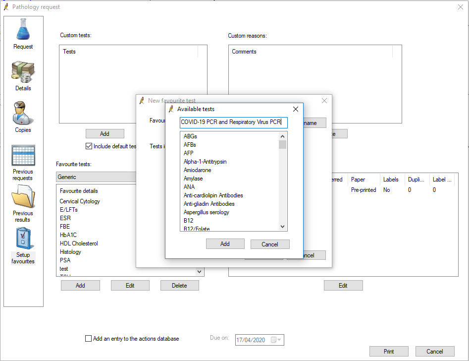 This article explains how to set up tests for COVID-19 as favourites in the pathology request screen.