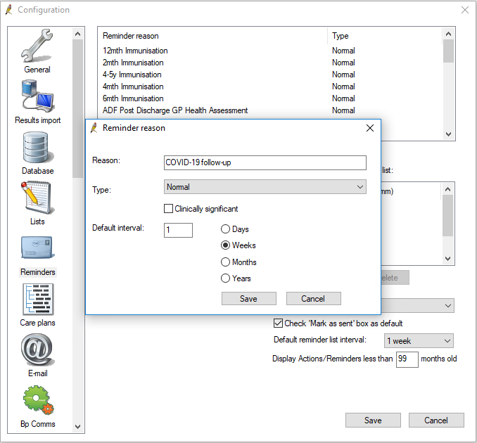 3. From the Reminder reason list, select COVID-19 follow-up, click Save, then click Close.