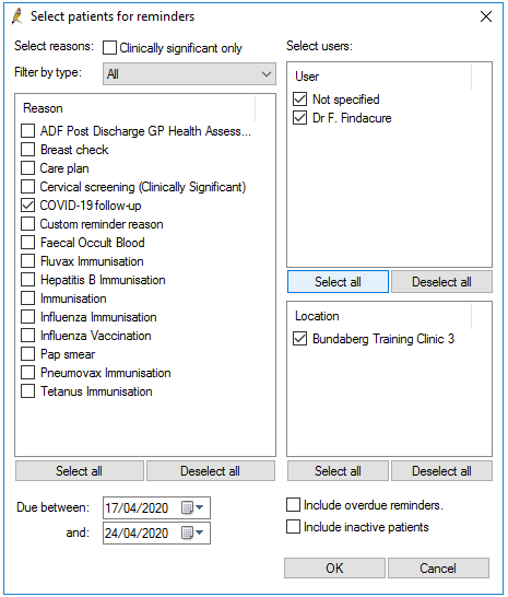 You may wish to set up specific reminders for patients requiring COVID-19 tests that need following up.